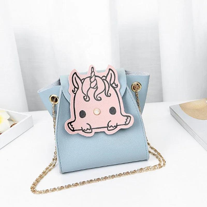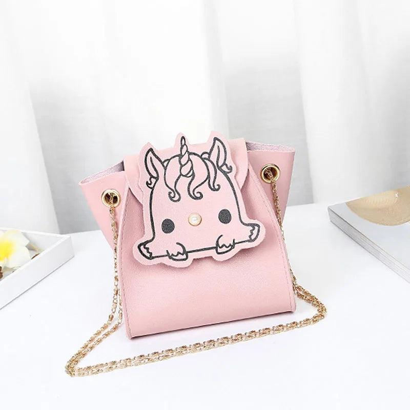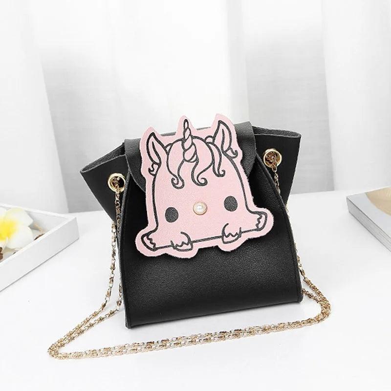 Stay stylish with this cute mini shoulder bag made of PU leather. Features a metal chain strap and a cartoon animal design. Perfect for girls on the go.
