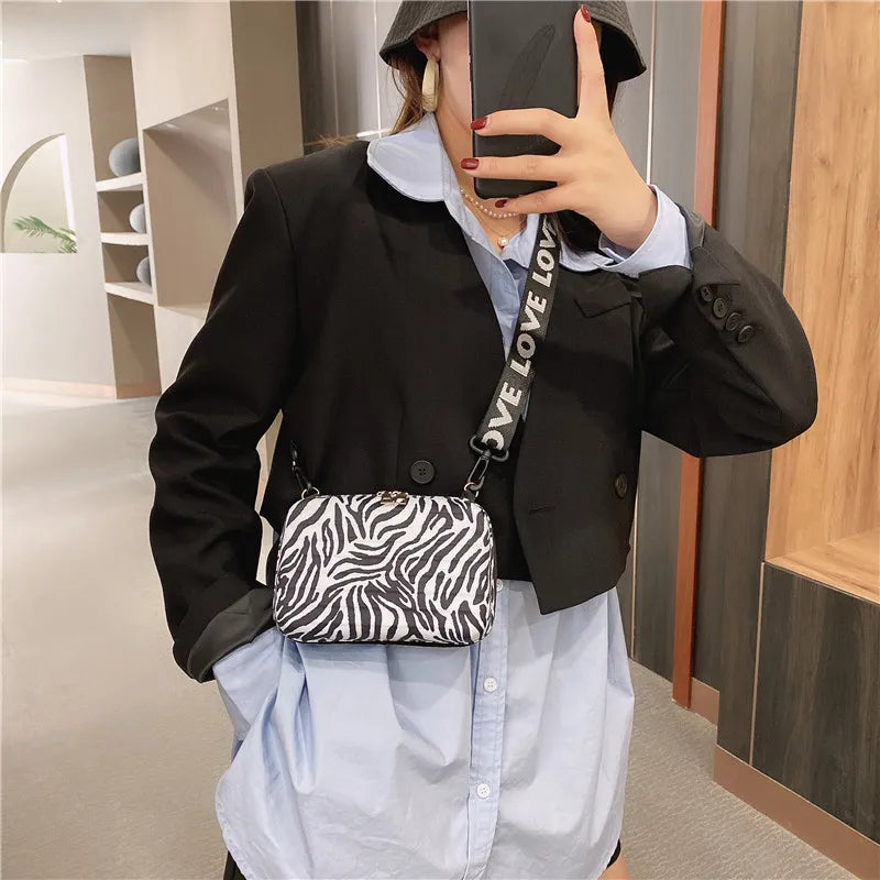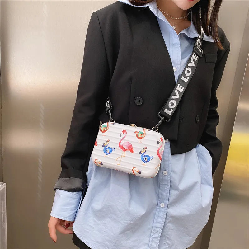 This stylish square box bag features a hardshell design with a wide shoulder strap and zipper closure. Perfect for carrying essentials on the go.