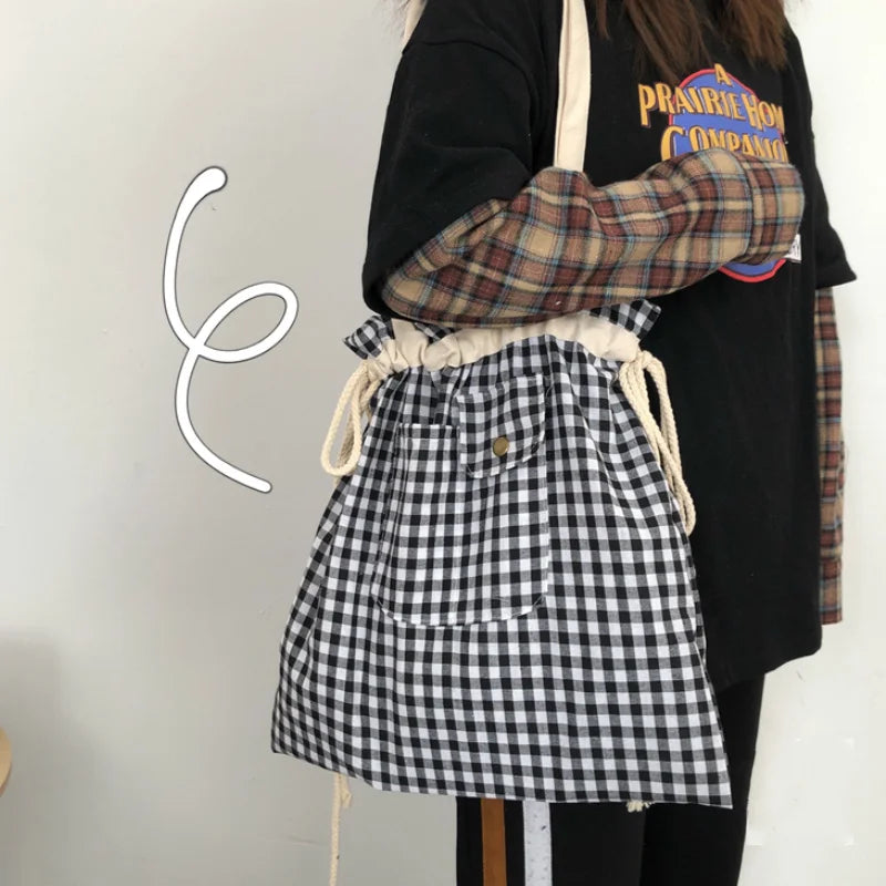 This casual and stylish canvas bag features a plaid design, adjustable drawstring closure, large capacity, and is perfect for students shopping.