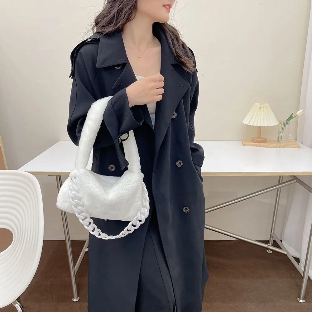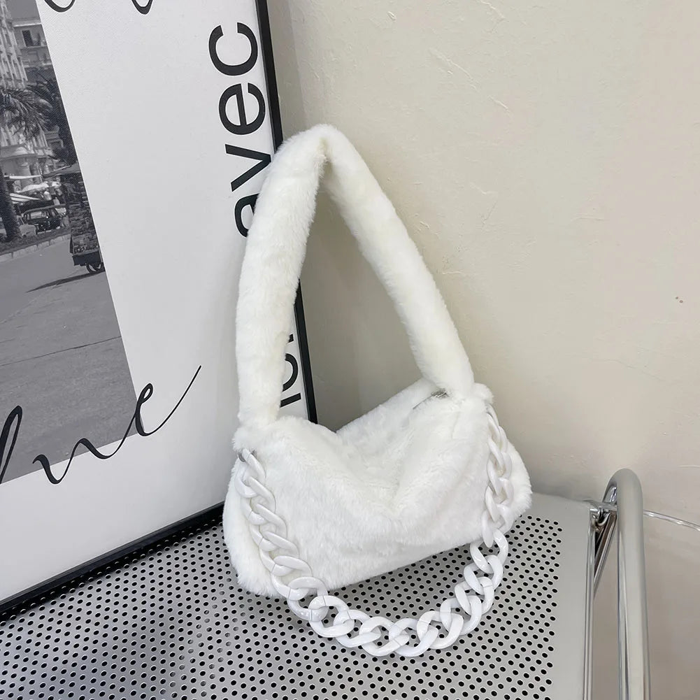 This plush underarm bag is designed for winter, featuring a soft and fluffy material that adds a touch of coziness to your outfit. It comes with a chain strap and a small purse tote for convenience.