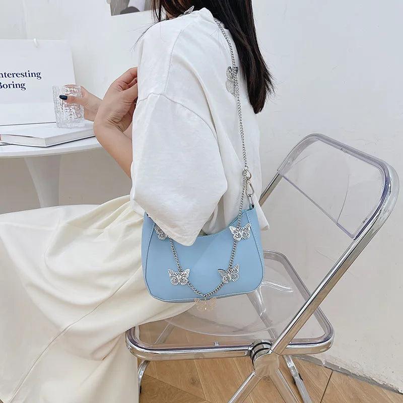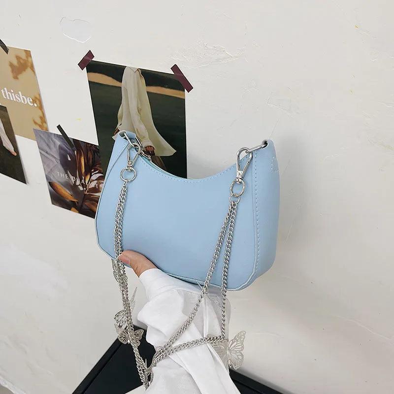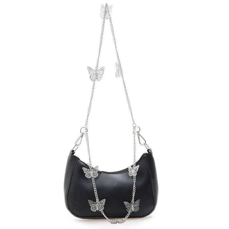 Stay stylish with this small shoulder underarm bag made of high-quality PU leather. Features a vintage butterfly design, chain strap, pure zipper closure, and compact size for essentials.