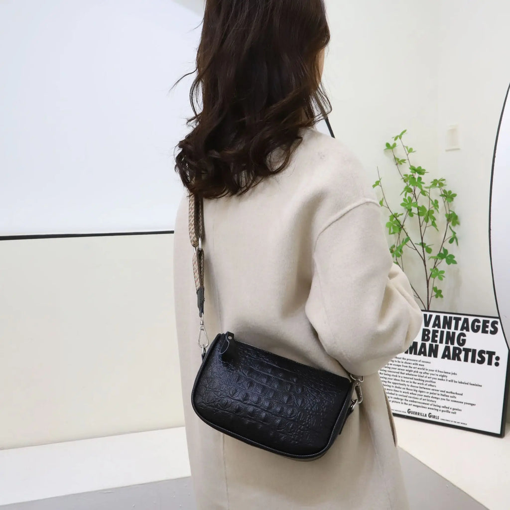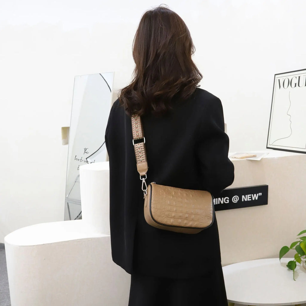 Women Shoulder Bag Crocodile Embossed Leather Wide Strap Crossbody Bags