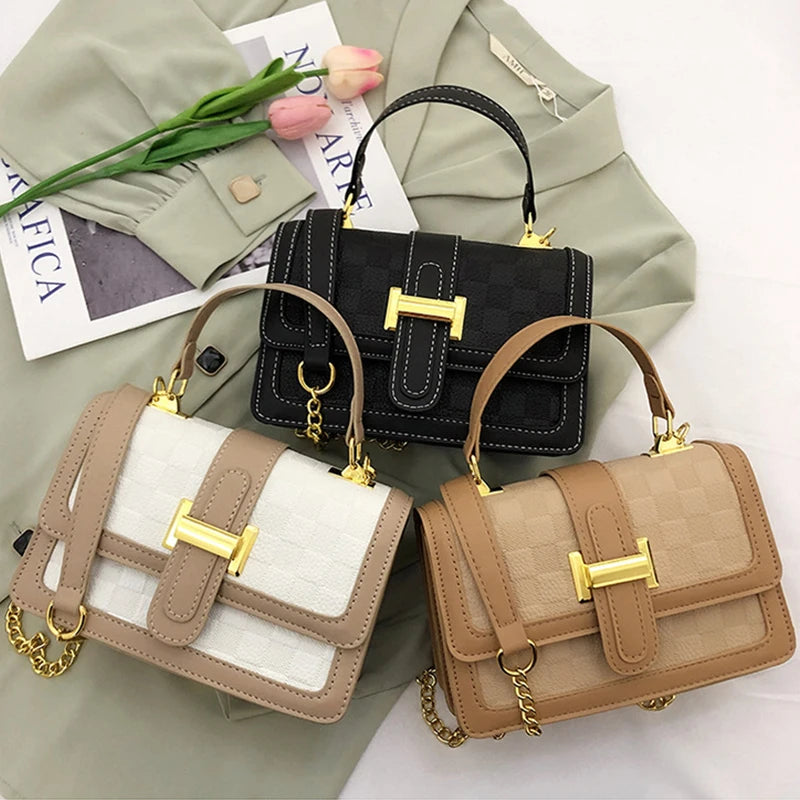 This stylish shoulder bag is perfect for women. It features a patchwork design in white, black, and khaki colors with a hasp closure. Ideal for everyday use and can be worn as a crossbody bag.