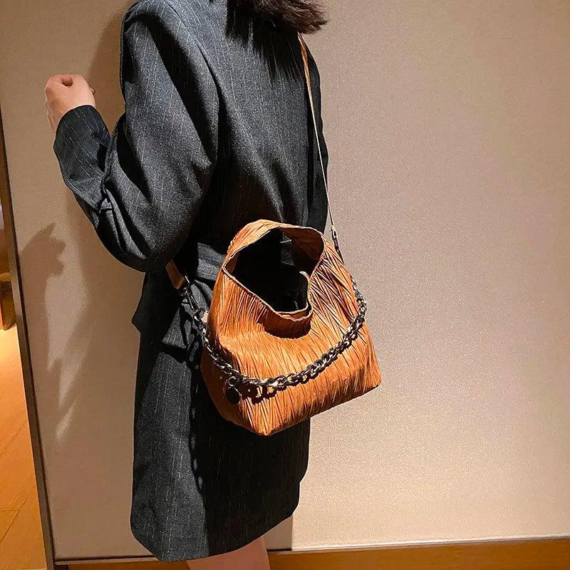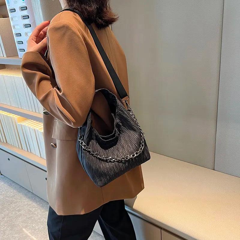 This women's shoulder bag features a chain design, high-quality fabric, and a bucket shape. It can be worn as a crossbody bag or carried as a tote, making it versatile and stylish.