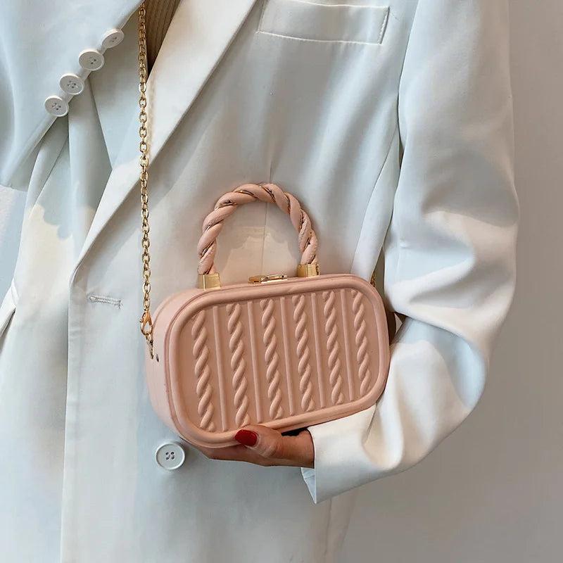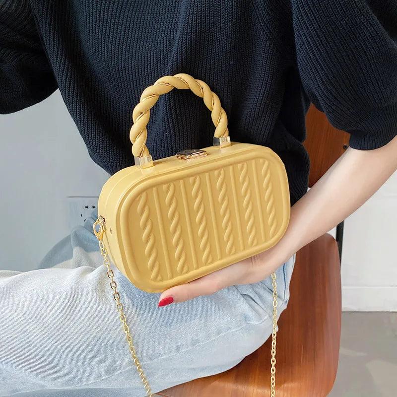 Get ready for your evening party with this stylish small box bag that features a chain crossbody design. Available in yellow and pink, this clutch is perfect for carrying your essentials in style.