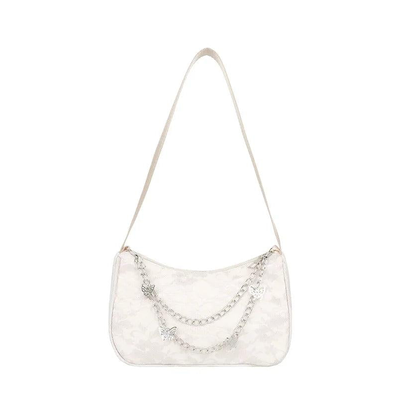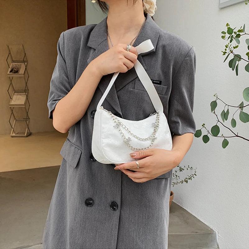 This small underarm bag is tailored for women and features a vintage design with a butterfly chain accent. It has a pure zipper closure and is perfect for carrying essentials.