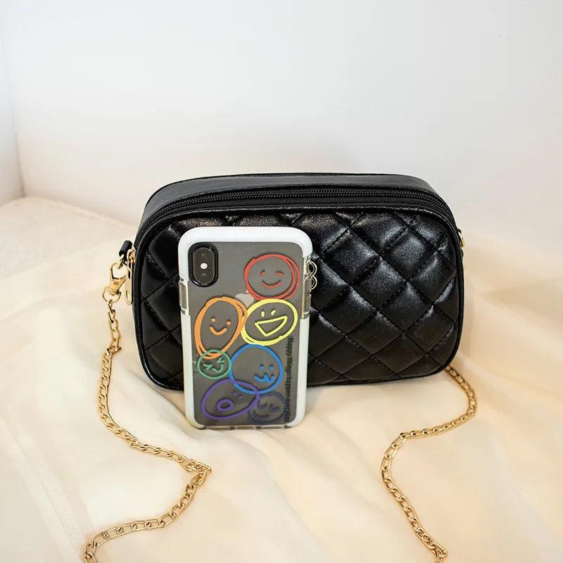 This women's mobile phone bag features a chain strap and is made of PU leather, perfect for carrying your essentials in style.