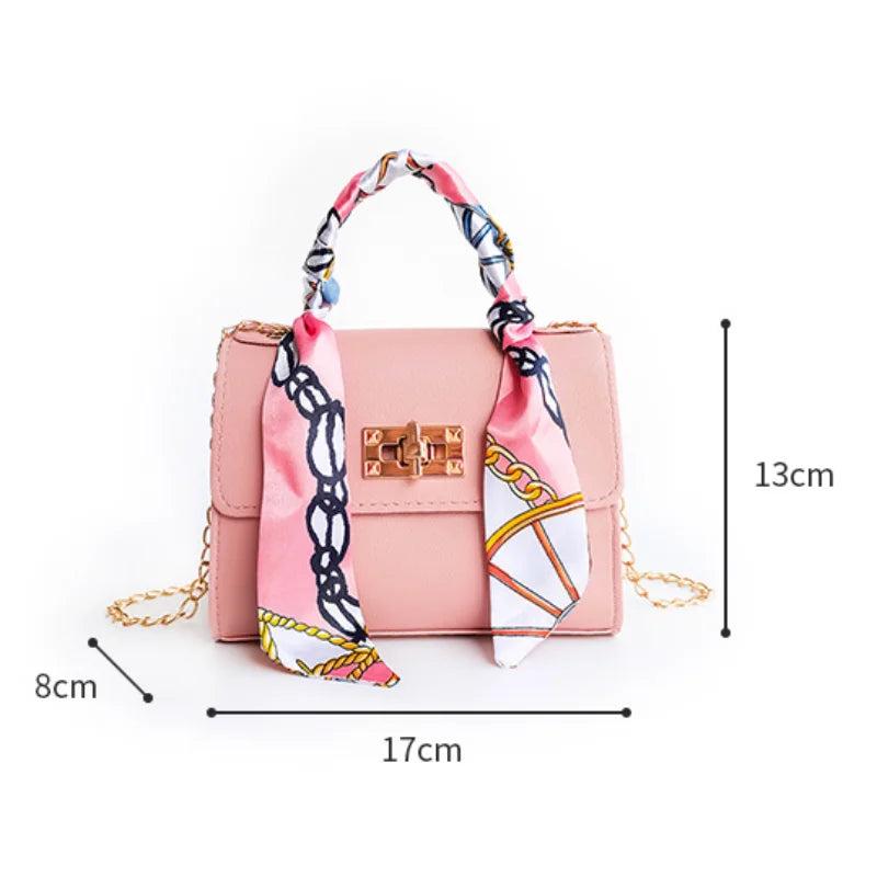 This stylish crossbody bag features a small square design and comes with a beautiful silk scarf. Perfect for everyday use or special occasions.