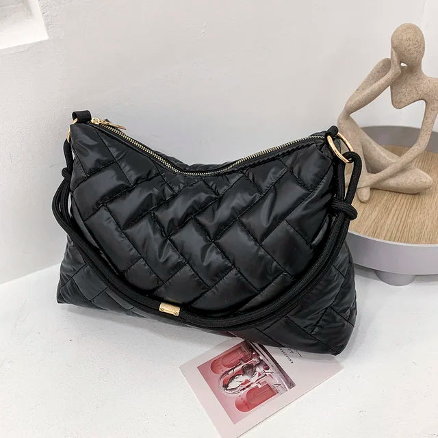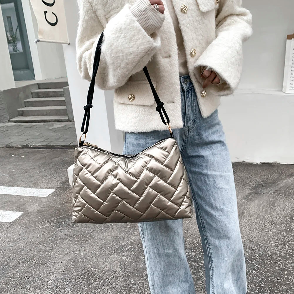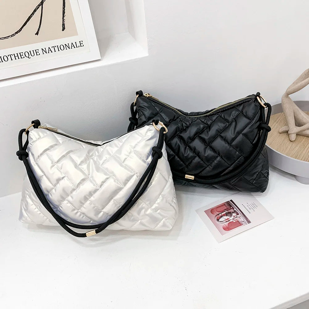 Women Space Padded Nylon Quilted Shoulder Bag Solid Zipper Top-handle Bags