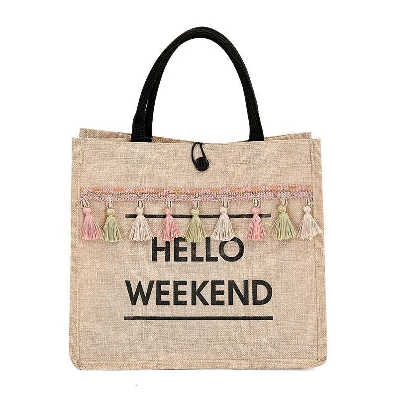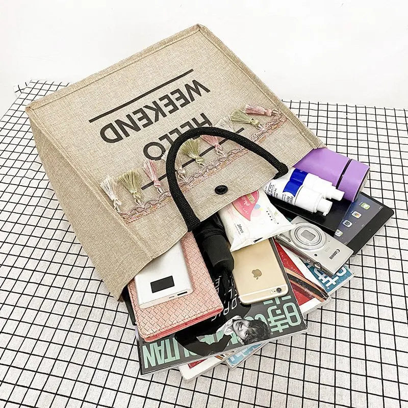Stay stylish and organized with this large capacity beach bag made of straw and linen. Perfect for casual outings, travel, or shopping. Features tassel shoulder straps for added flair.
