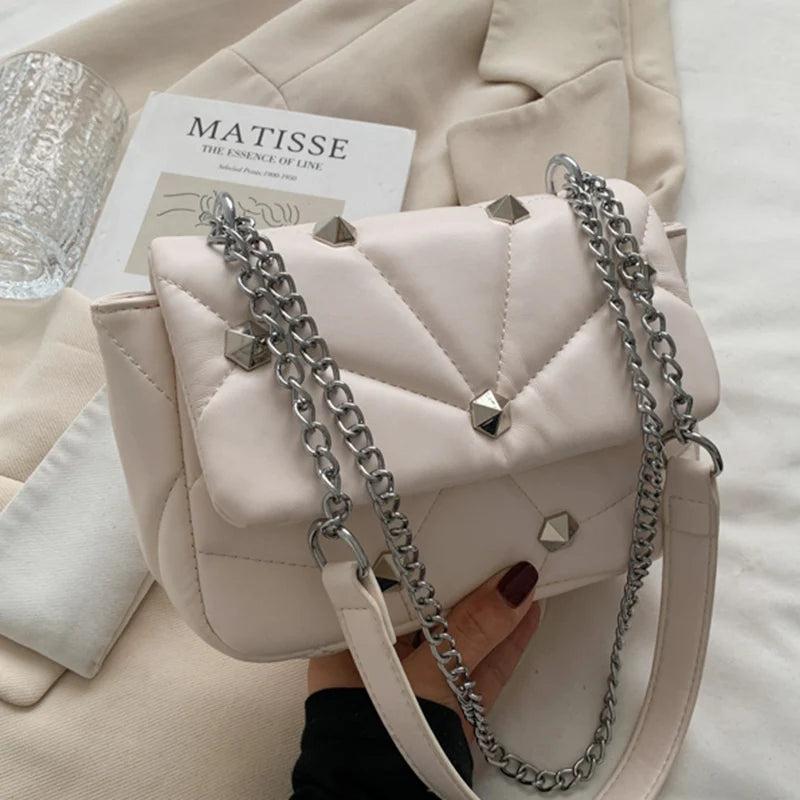 This stylish green crossbody bag features a thick chain strap and rivet details. Perfect for any occasion, it is both practical and fashionable.