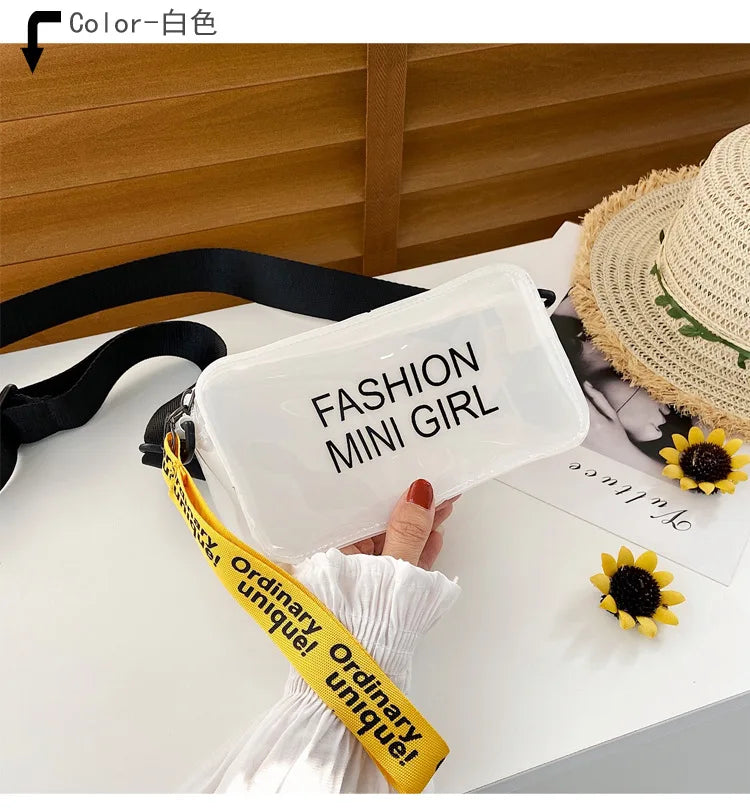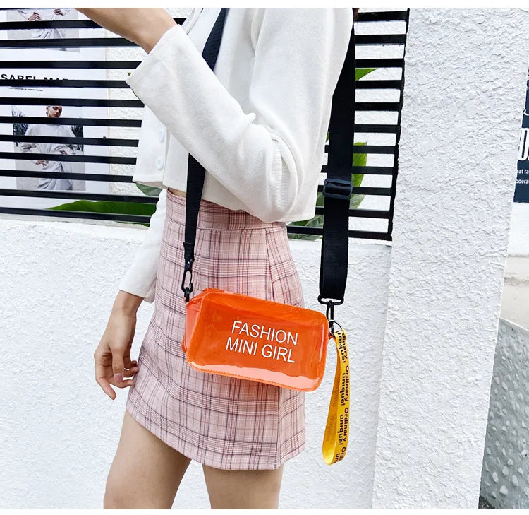Stay stylish and hands-free with this chic cross-body pack featuring a transparent design with handle and letter prints. The square bucket shape adds a trendy touch to any outfit.