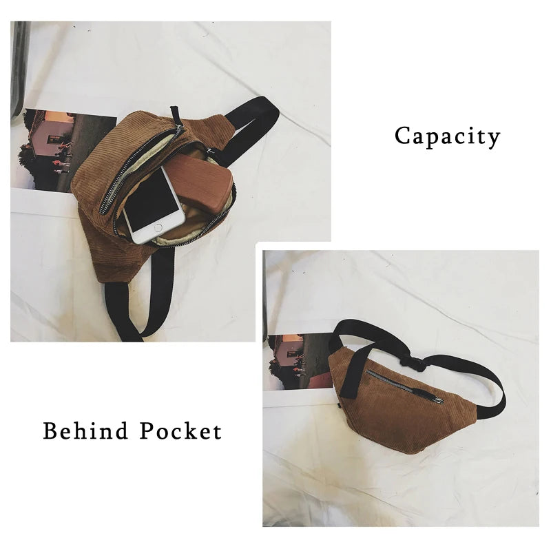 Stay organized and stylish with this women's waist bag made of durable corduroy and canvas materials. Perfect for carrying money, phone, and other essentials.