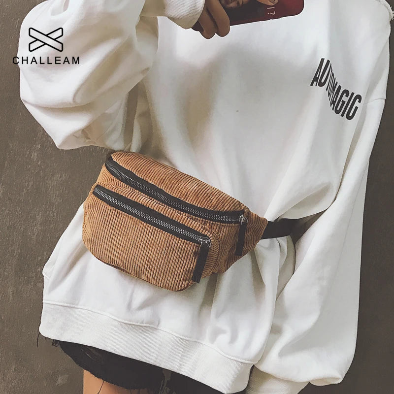 Women Waist Bag Corduroy Canvas Fanny Pack Brown Money Phone Chest