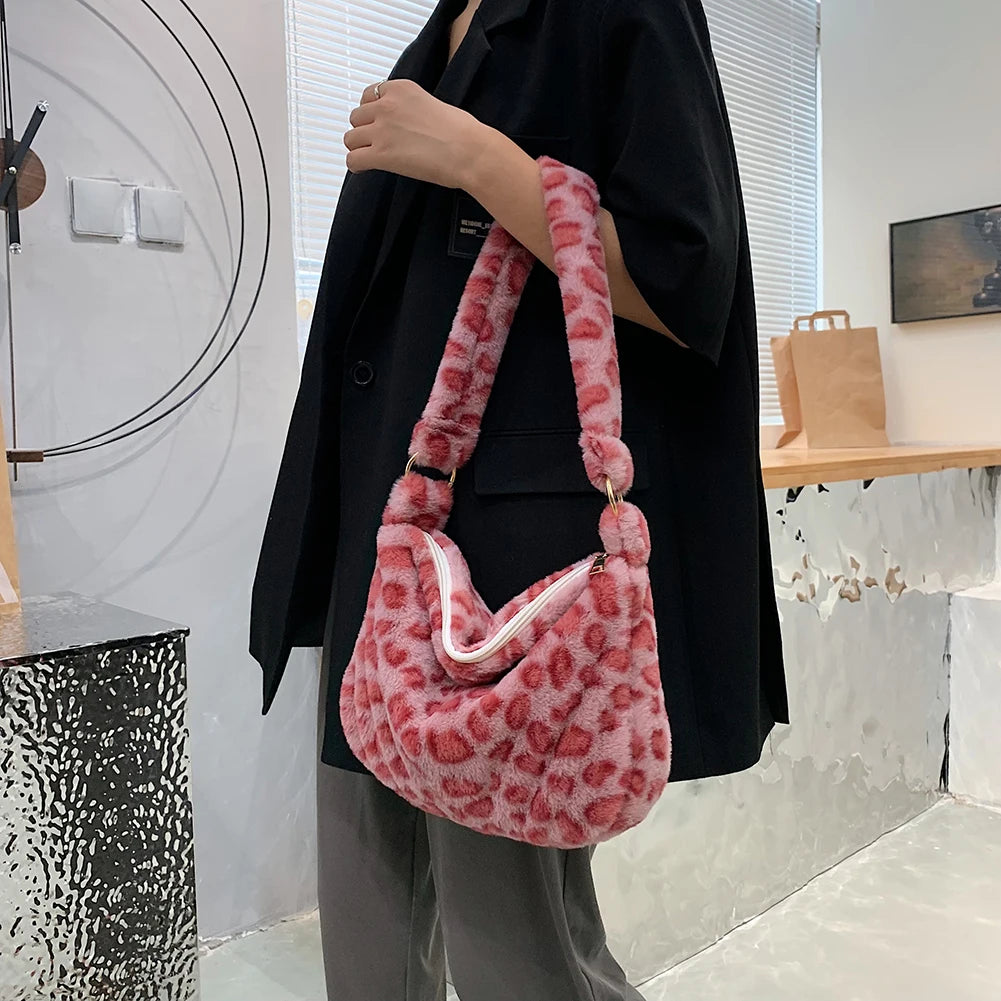 Women Winter Soft Plush Red Leopard Shoulder Bags Female Cow Print Underarm Bag