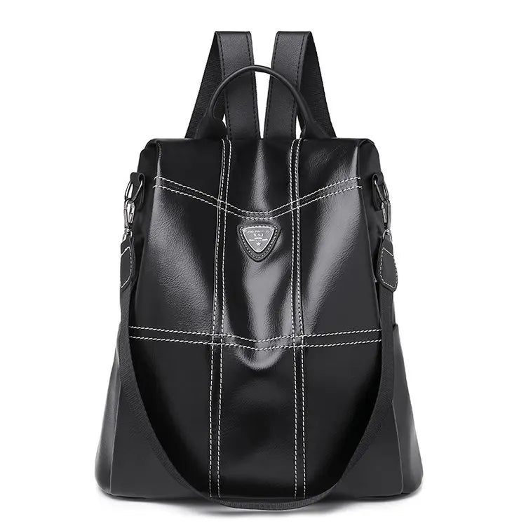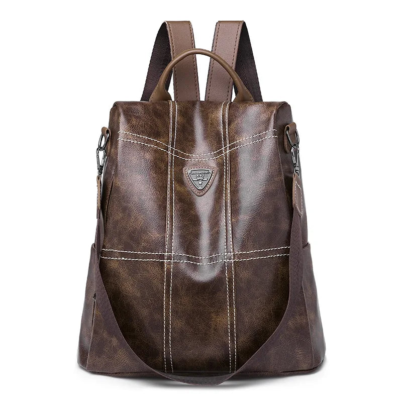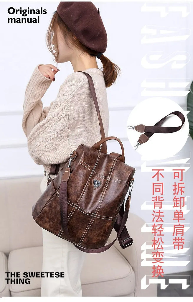 This large-capacity backpack is perfect for women on the go. Made of soft PU leather, it features anti-theft design, waterproof material, and a stylish brown color.