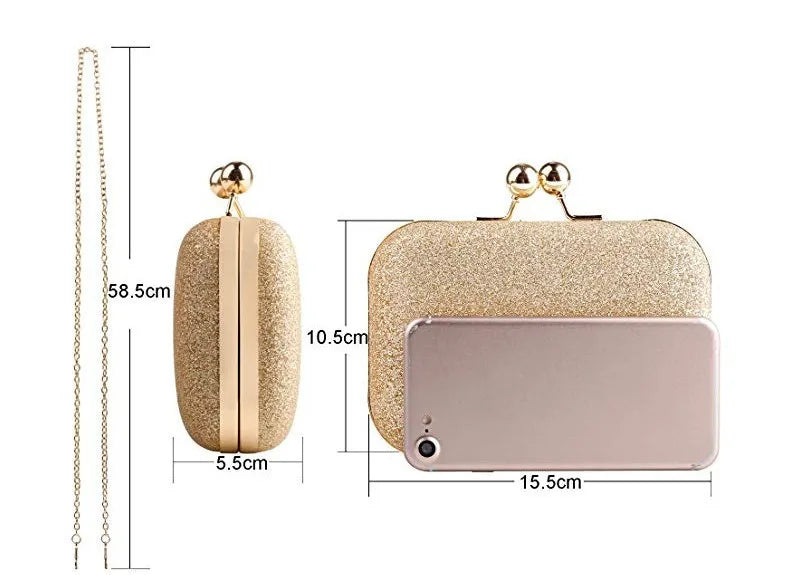 This stylish mini minaudiere handbag is perfect for evening parties, weddings, and special occasions. It features a dazzling bling design with a detachable chain strap.