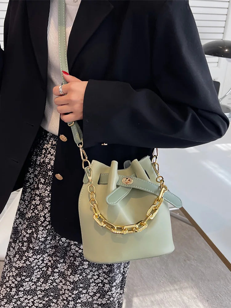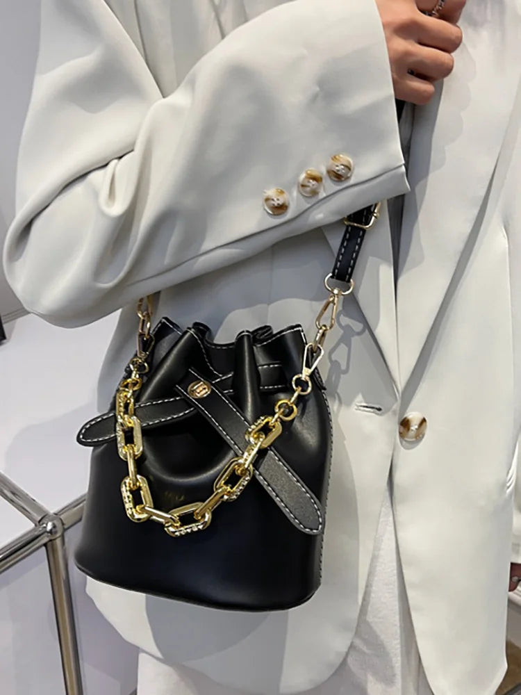 Elegant and stylish bucket bag with chain shoulder strap for women made of high-quality PU leather. The perfect accessory for any outfit.