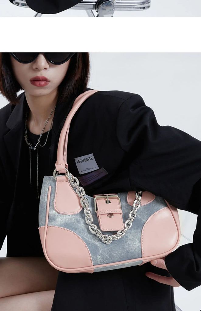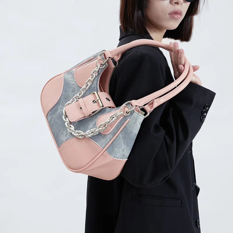 Stay trendy this winter with this stylish half moon tote handbag featuring a chain strap. Made of high-quality PU and denim materials, this crossbody bag is perfect for completing your winter outfit.