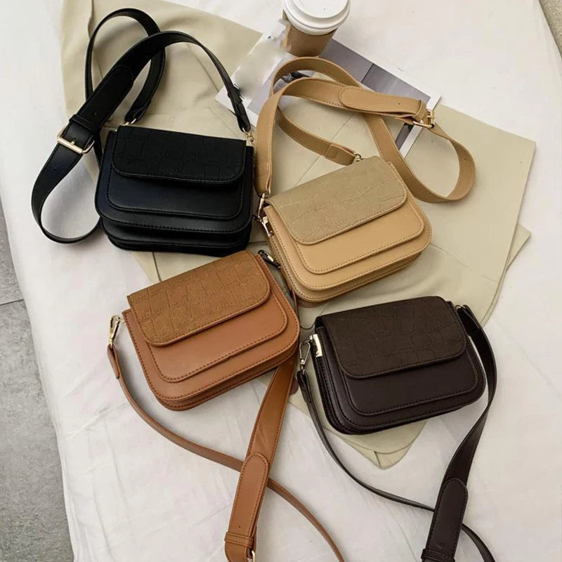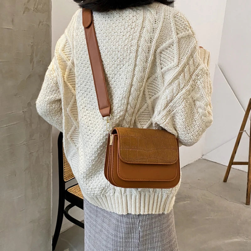 This vintage messenger bag is made of PU leather with a crocodile leather pattern. It features a shoulder strap and a flap closure. Perfect for everyday use.