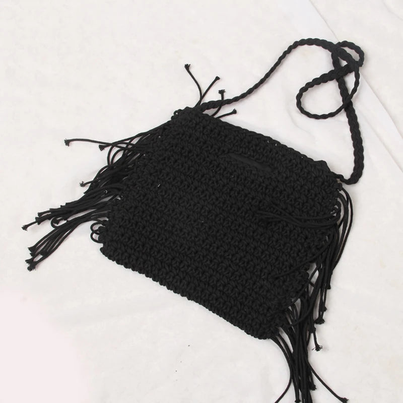 Stay stylish and beach-ready with this woven cotton crossbody bag. Perfect for summer, this bohemian chic bag features fringed details and a straw construction. Ideal for a day at the beach or a casual outing.