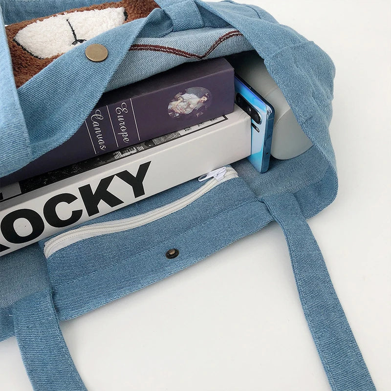 Women's Embroidered Bear Denim Shoulder Bag Large Capacity Casual Handbags
