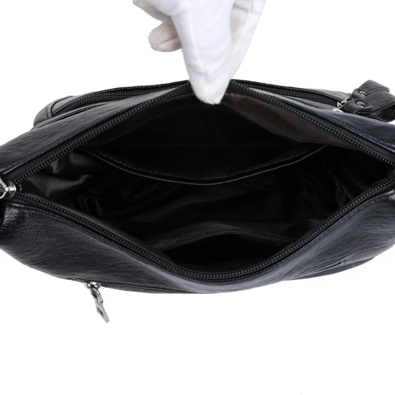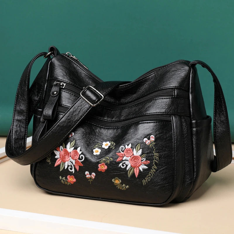 Stay stylish with this PU leather handbag that features intricate embroidery. Perfect for any occasion, this bag offers both functionality and fashion.