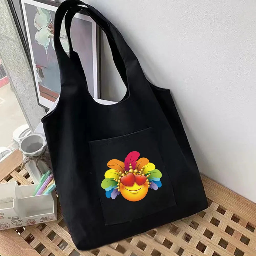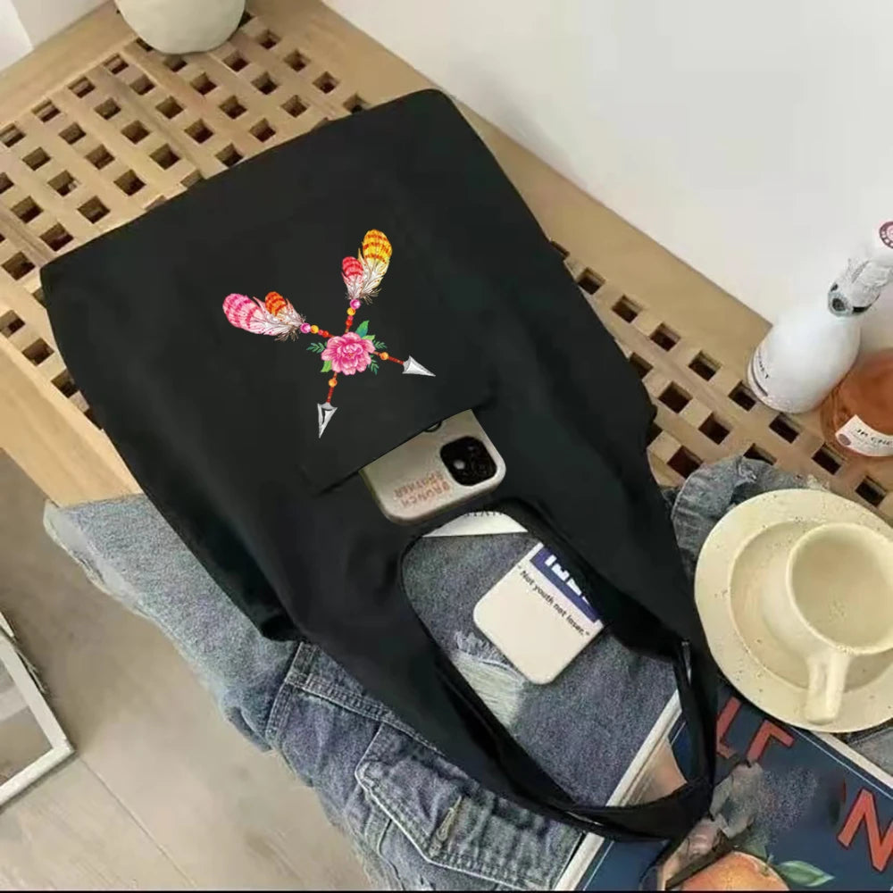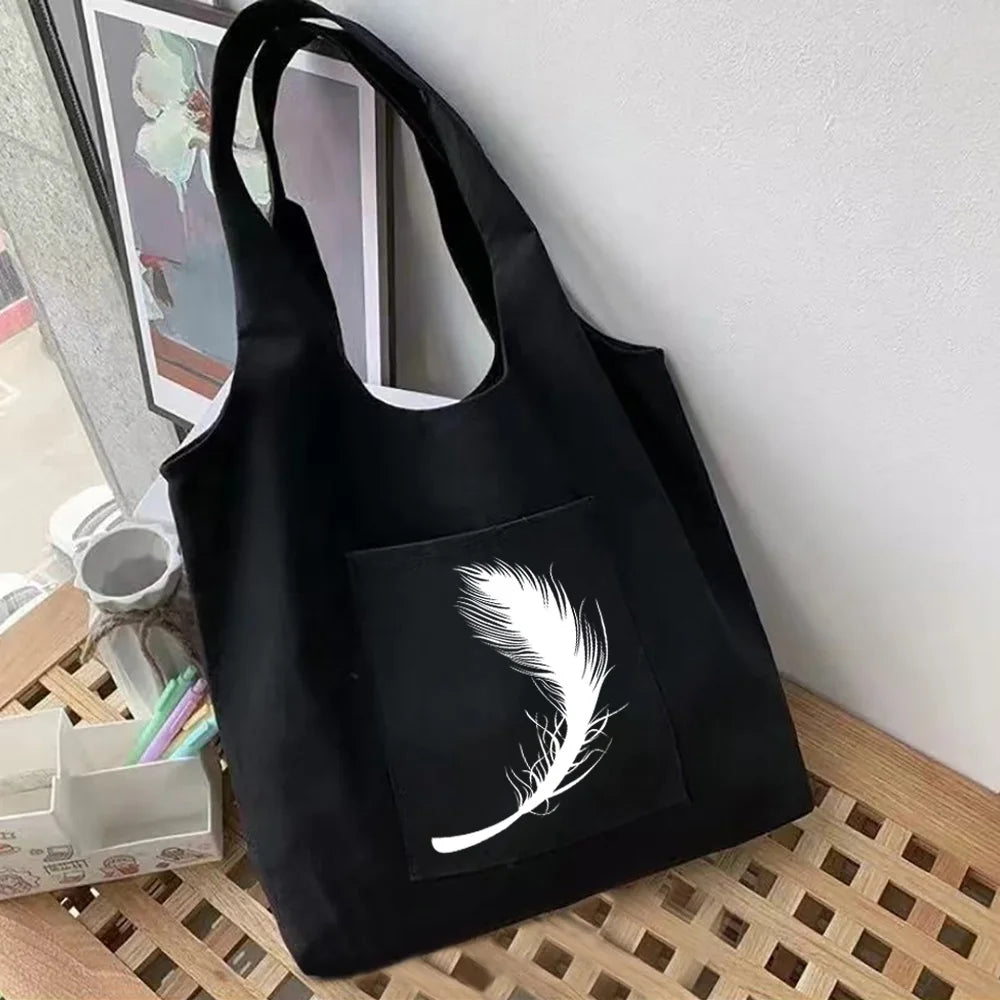 This shoulder shopper vest bag features a feather series design on cotton canvas, making it a stylish and eco-friendly choice for your shopping needs.