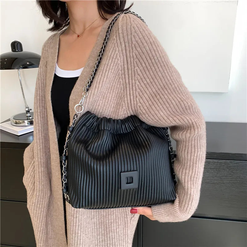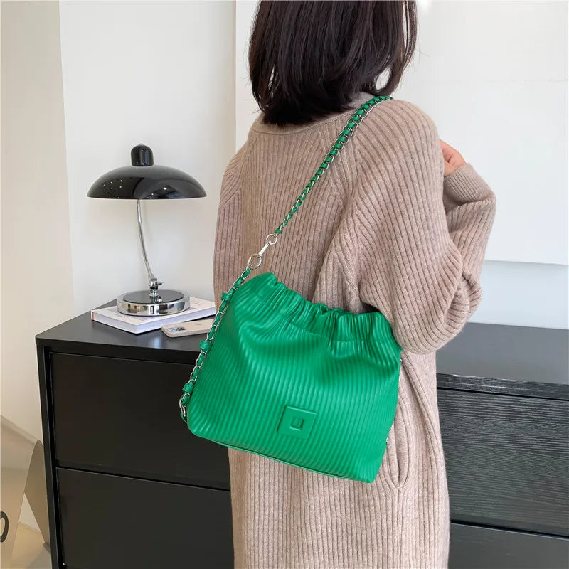 Elevate your style with this unique and trendy bucket bag featuring fine chains. Perfect for adding a touch of personality to any outfit.