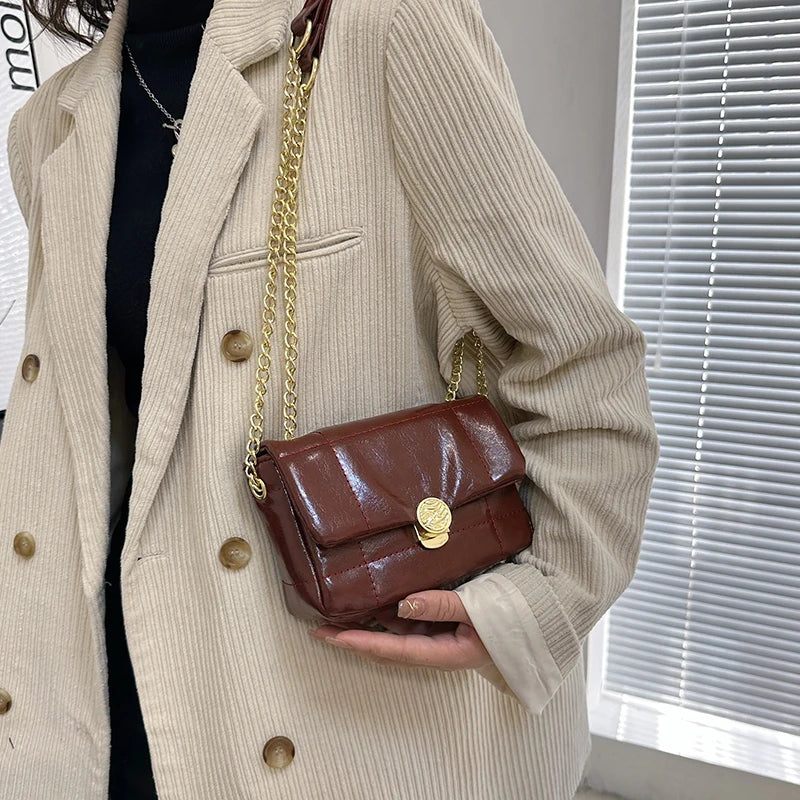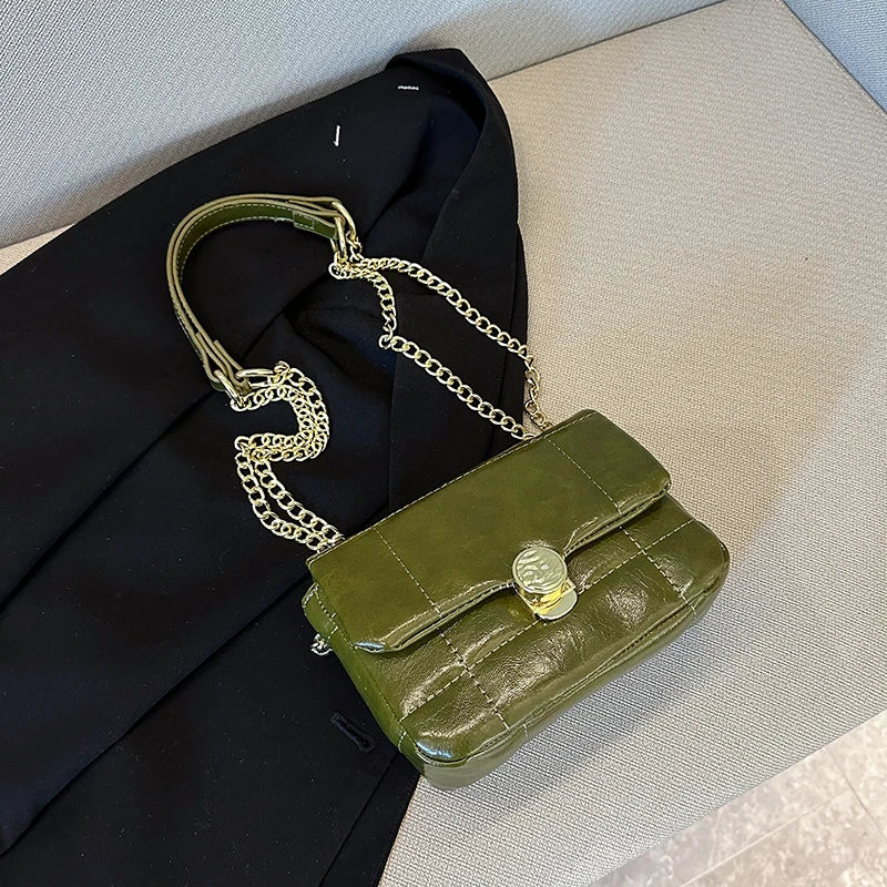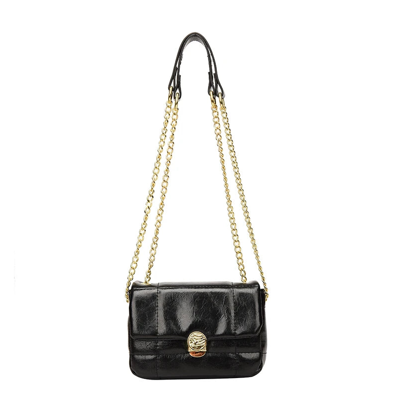This elegant leather handbag is the perfect accessory for any occasion. With a chain shoulder strap and square Boston design, it exudes style and sophistication.