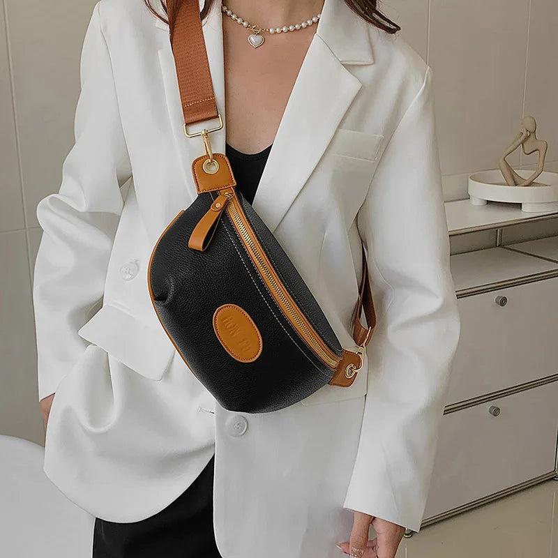 Stay stylish and organized with this versatile leather fanny pack that can also be worn as a crossbody or shoulder bag.