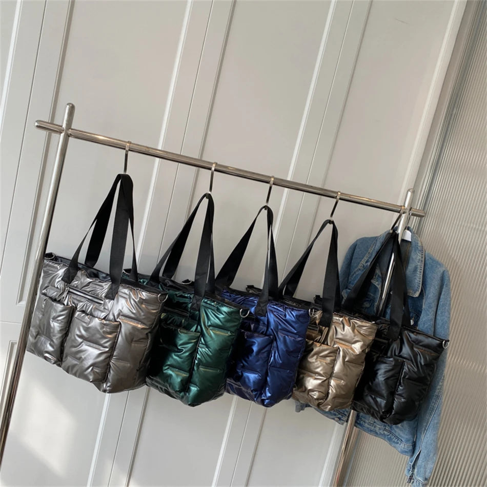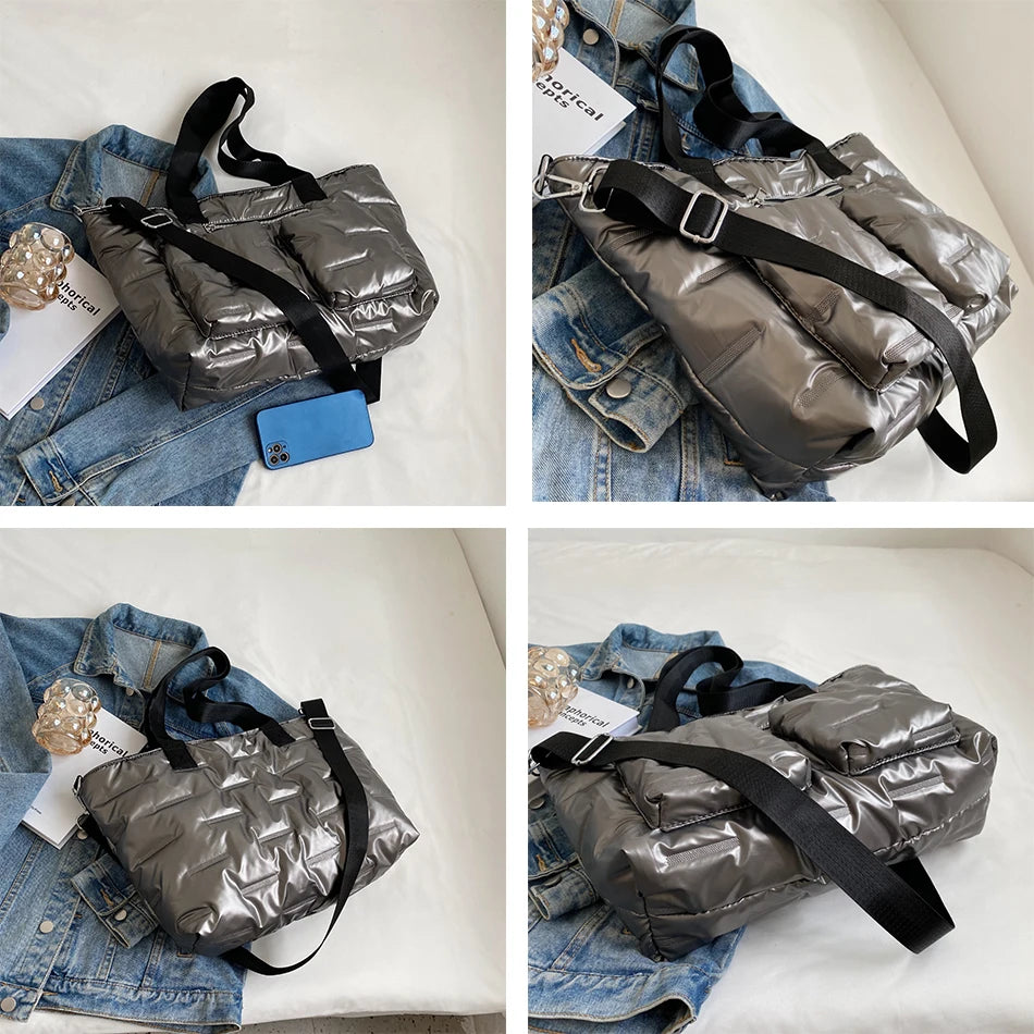 Description:Stay warm and stylish this winter with this large padded shoulder bag made from down fabric. The bag features a striped design and ample space for all your essentials.Features: Padded down fabric for warmth and comfort Large size for carrying all your essentials Striped design for a stylish touch Crossbody...