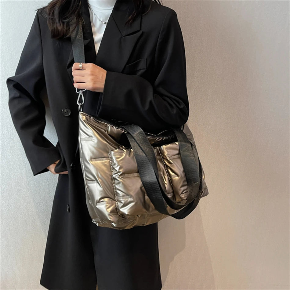 Stay warm and stylish this winter with this large padded shoulder bag made from down fabric. The bag features a striped design and ample space for all your essentials.