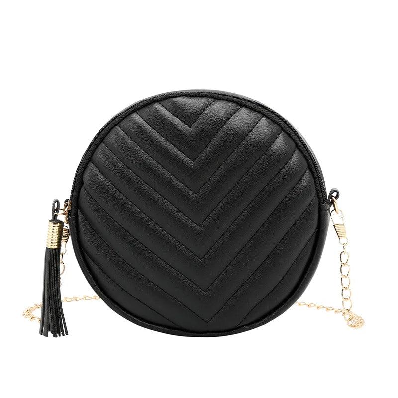 This circular shoulder bag features a vintage retro design with a metal chain and tassel pendant, perfect for adding a stylish touch to your outfit.