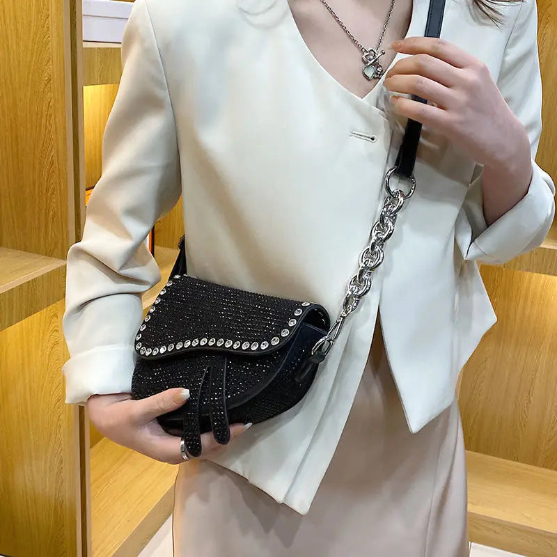 Description:This stylish shoulder bag is made of PU leather and features a rhinestone design. Perfect for casual outings, this crossbody bag is a must-have accessory for any woman.Features: Made of high-quality PU leather Decorated with dazzling rhinestones Ideal for everyday use Adjustable crossbody strap for convenience Secure saddle bag design...