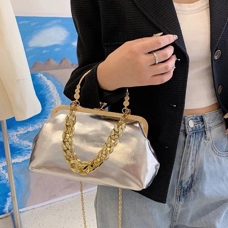 This stylish silver green shoulder bag features a chain strap and a shell clip design. Made of high-quality PU leather, it's perfect for everyday use.