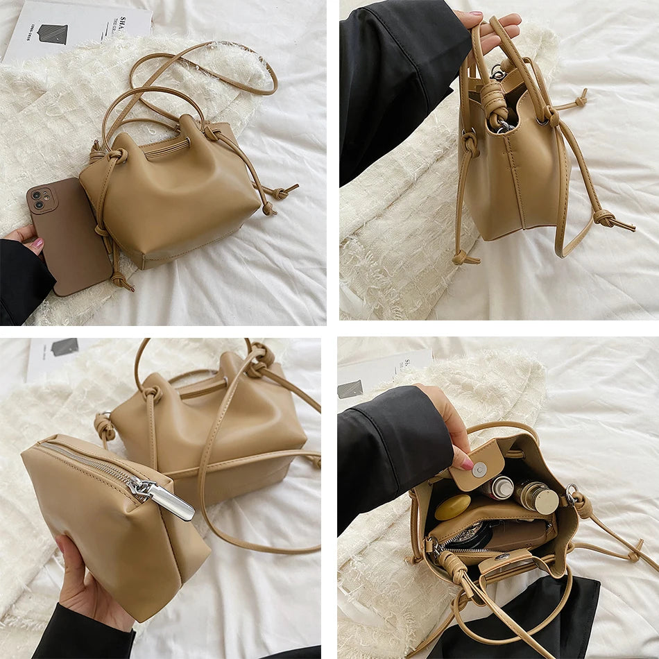 This small bucket bag is made of soft PU leather, perfect for fall. It can be worn as a shoulder bag or crossbody. The bag is versatile and stylish, suitable for everyday use.