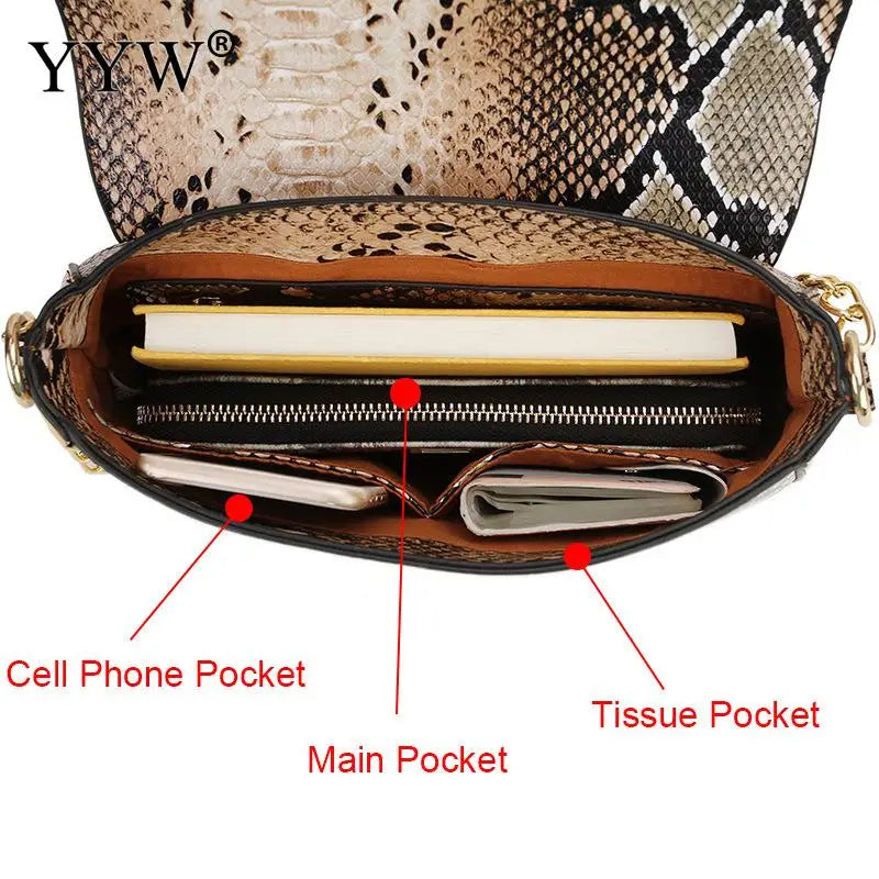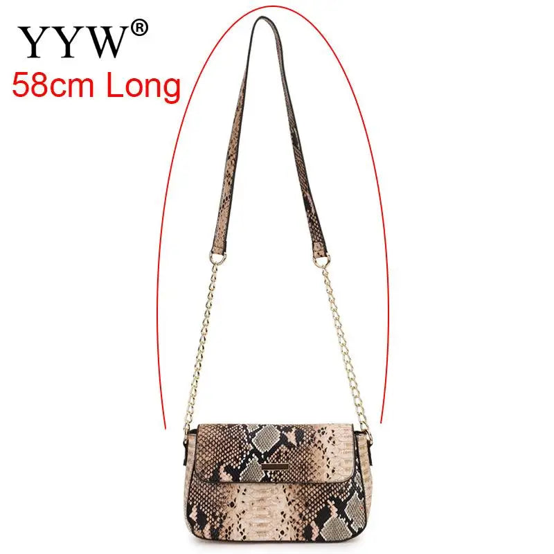 This stylish crossbody bag is made of high-quality PU leather featuring a trendy snake print. It has a flap closure and a chain shoulder strap, perfect for women and girls.