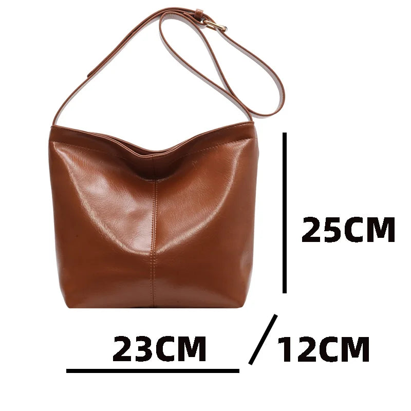 Stay stylish with this casual bucket shoulder bag made of soft leather. Perfect for everyday use, this bag is a must-have for any fashion-forward lady.
