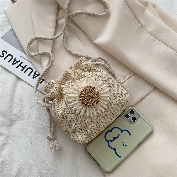 Women's Straw Beach Bag Sunflower Drawstring Bucket Crossbody