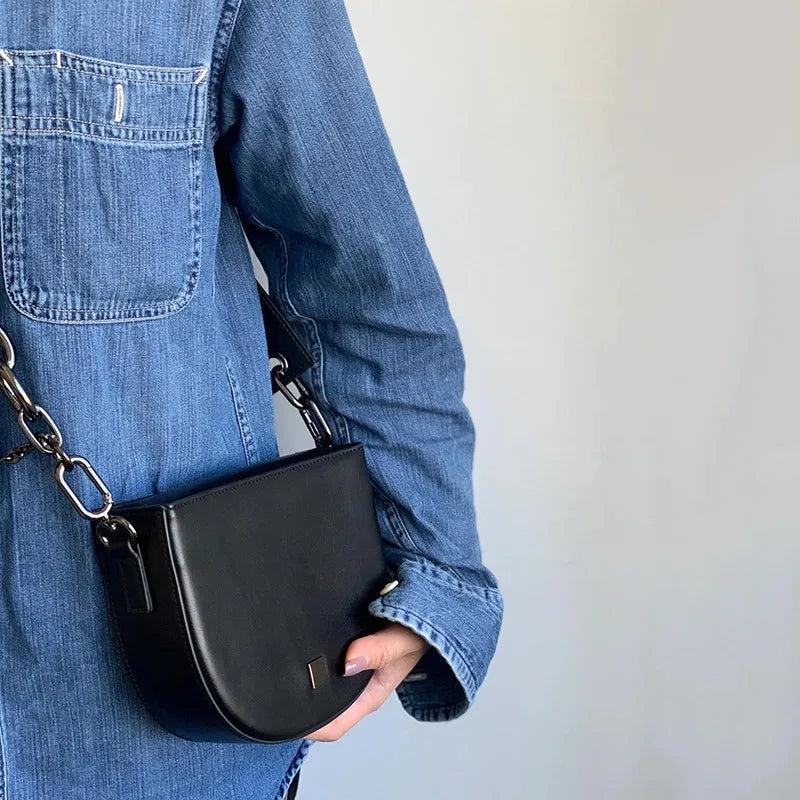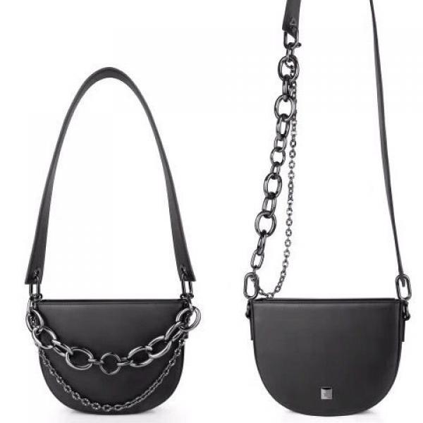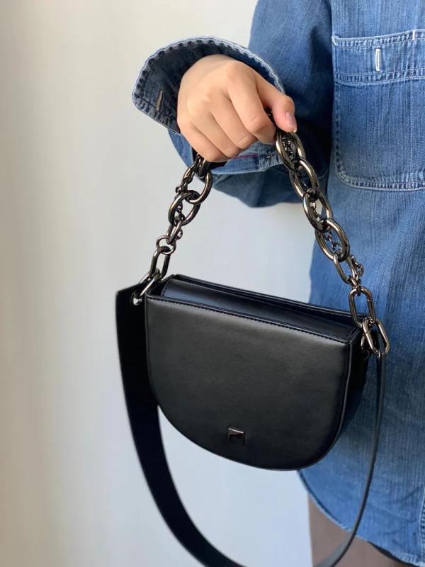 This stylish and trendy bag features a semicircle design with a thick chain detailing. Made of high-quality PU leather, it is perfect for everyday use and can easily elevate any outfit.