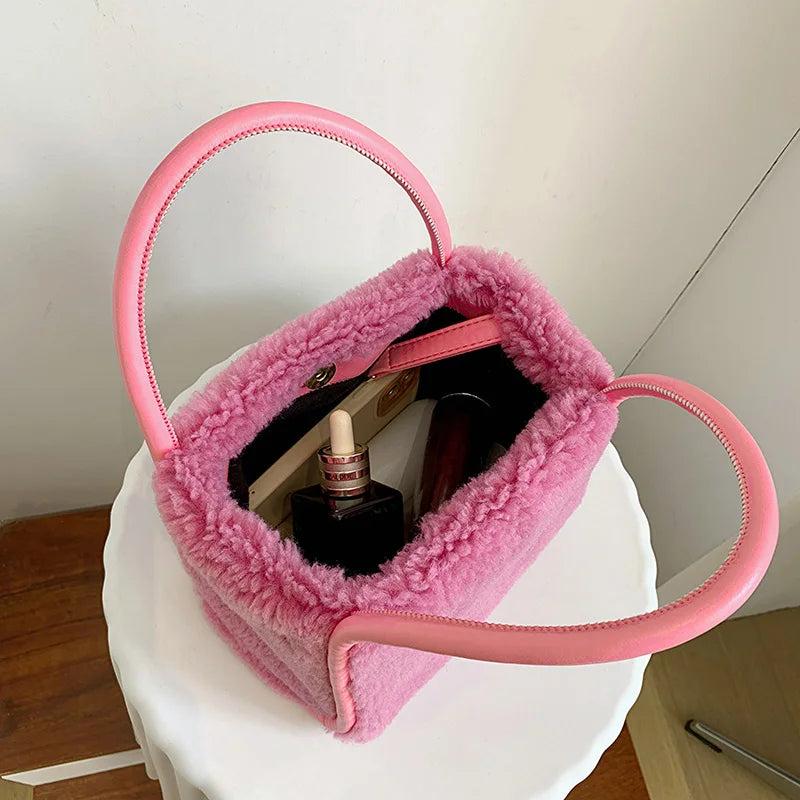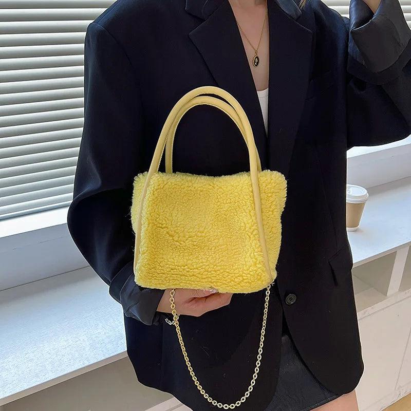 Stay cozy and stylish with these woolly shoulder bags featuring faux fur accents. Perfect for winter!