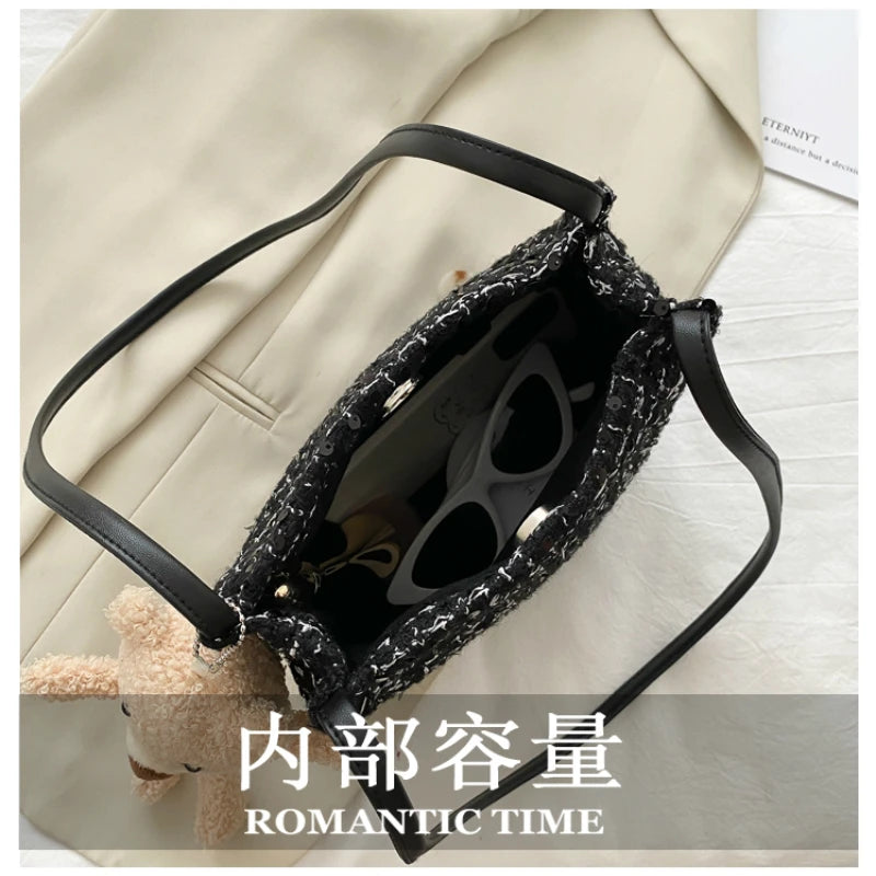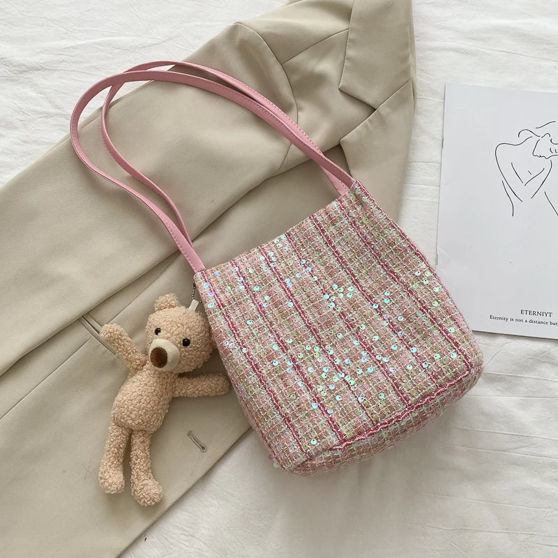 Wool Woven Bucket Handbag Women Sequined Bling Bling Shoulder Bags
