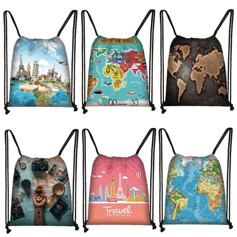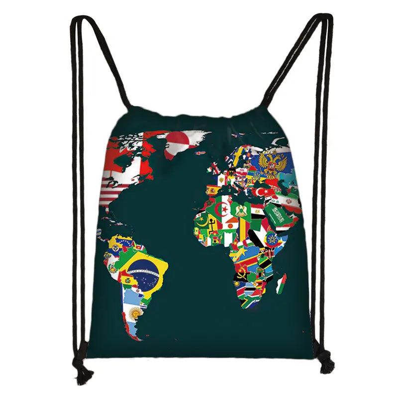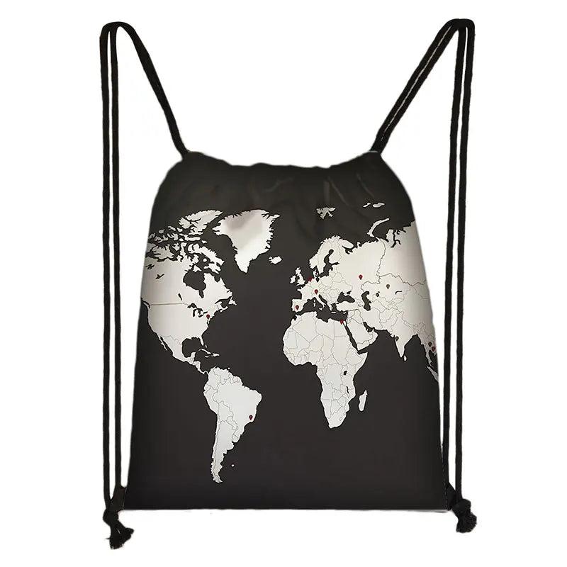 World Map Print Backpack Drawstring Bag Softback Shoulder Bag