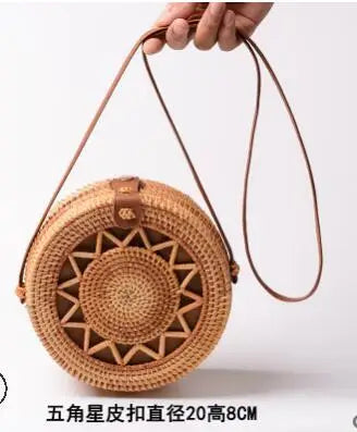 This woven rattan bag is perfect for the beach or casual outings. Its round shape, straw material, and hollow design make it a stylish choice for any occasion.