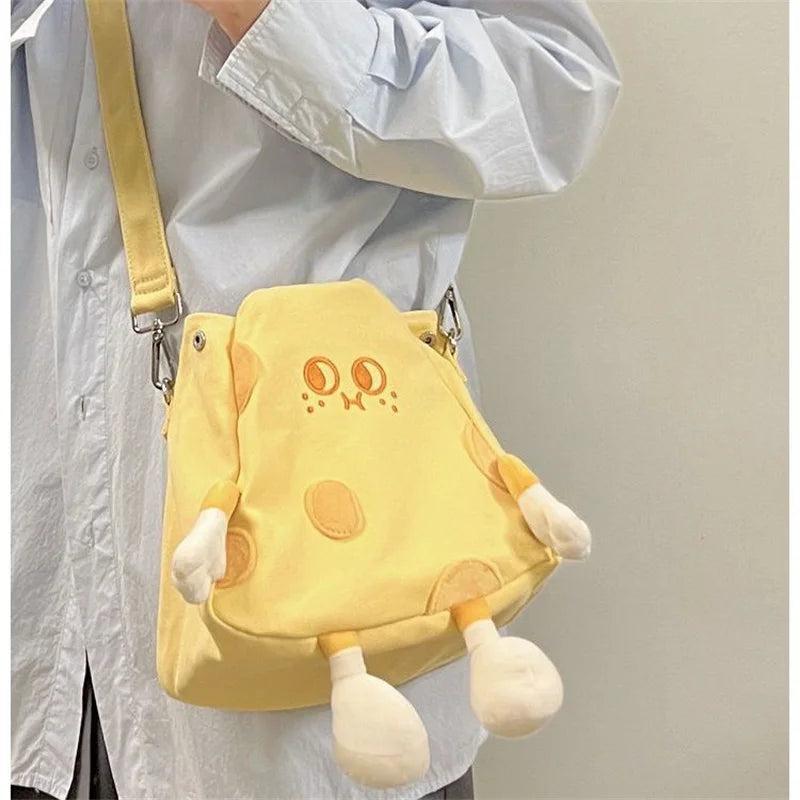 This cute and trendy yellow diagonal bag is perfect for everyday use. It features a cheese doll design, making it a fun addition to any outfit.