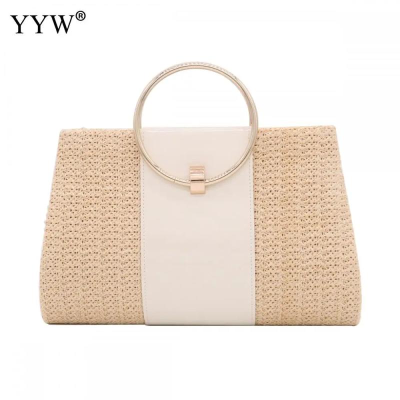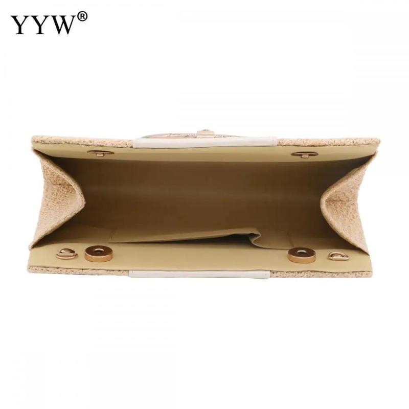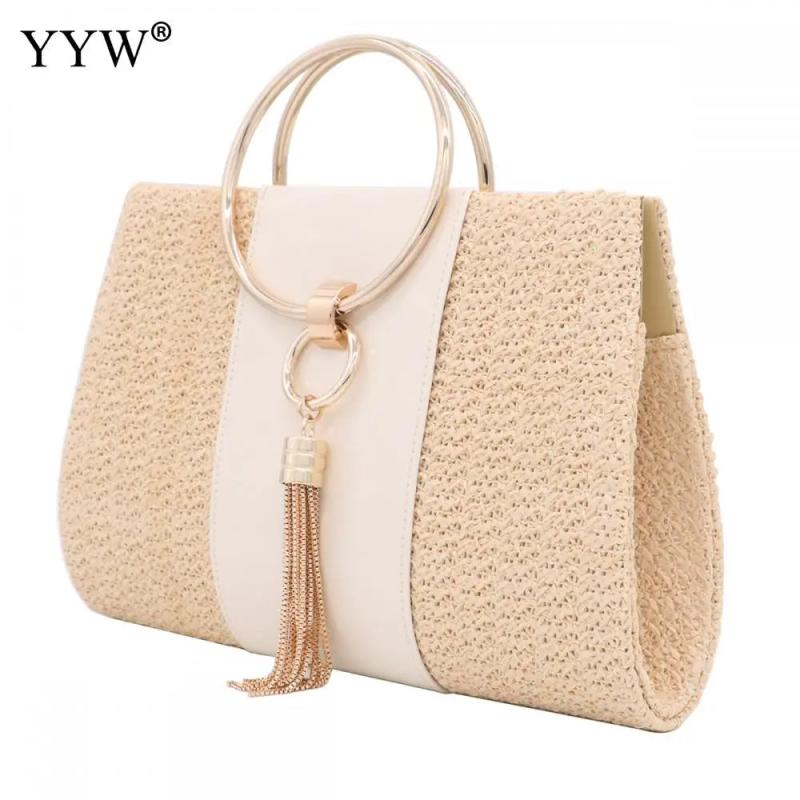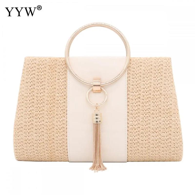 Yellow Straw Women Evening Clutches PU Leather Tassel Weave Envelope Purse