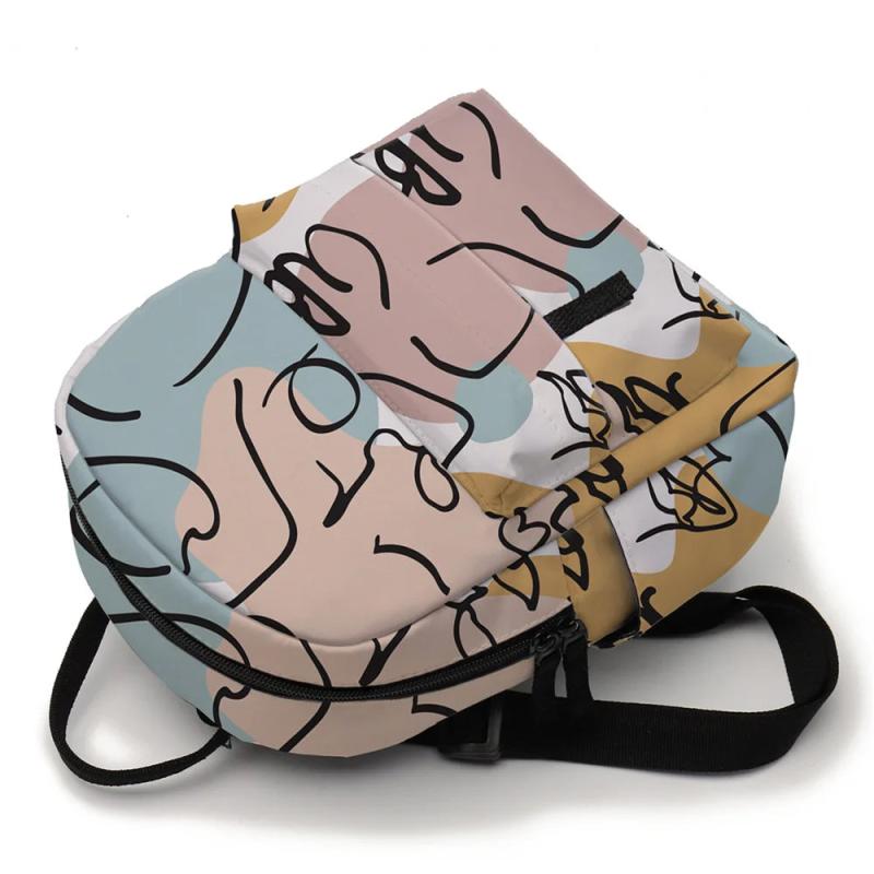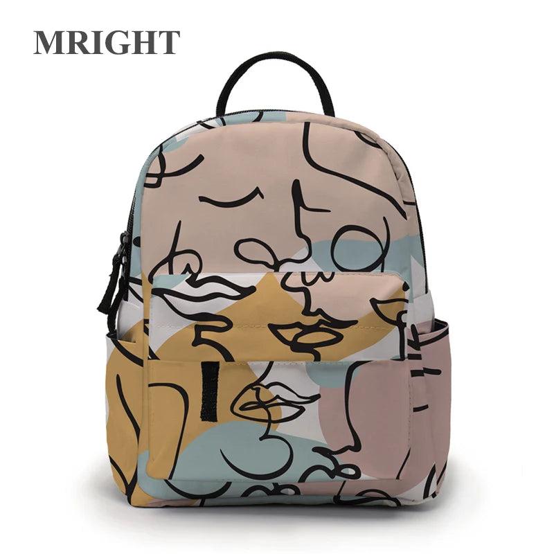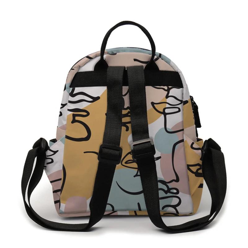 This versatile mini backpack features an abstract line face print in vibrant multicolours. The waterproof design makes it perfect for school, casual outings, or travel.