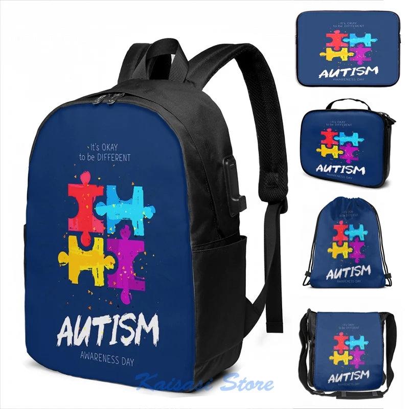 Autism Awareness USB Charge Backpack School Travel Laptop Bag