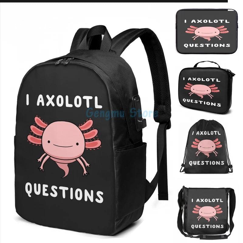 This hilarious Axolotl graphic print backpack is perfect for school, travel, or work. Equipped with a USB charging port, it's convenient and stylish.